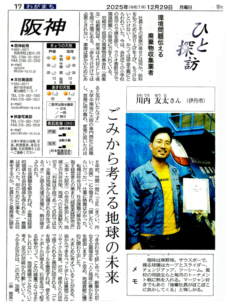 2025年12月29日付の神戸新聞(阪神版)「ひと探訪」にて、弊社4代目予定の川内友太をご紹介いただきました。
